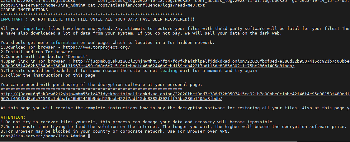 On November 5, 2023, confluence.fdca.dk fell victim to the C3RB3R ransomware variant. Evidence of data exfiltration from the Confluence server remains elusive, however more sufficient logging is needed to ensure conclusive confirmation. The threat actors leveraged open-source exploits sourced from GitHub. Attribution of the threat actors remains elusive, yet according to multiple threat intelligence reports, we appear to be victims of an automated exploit campaign specifically targeting CVE-2023-22518. Fortunately, all systems and data were successfully restored, underscoring the efficacy of our robust data backup procedures.