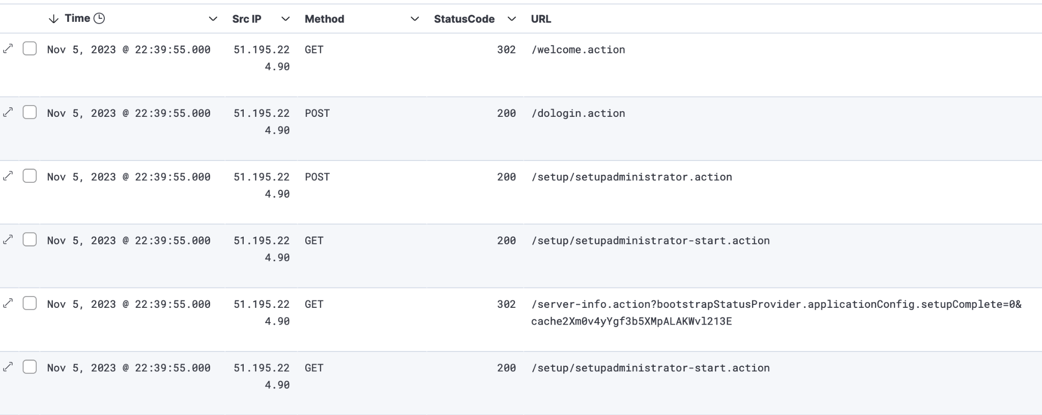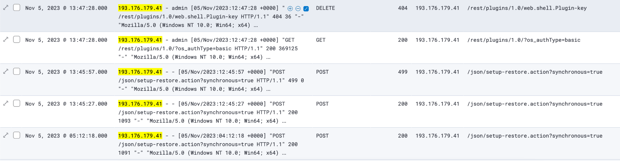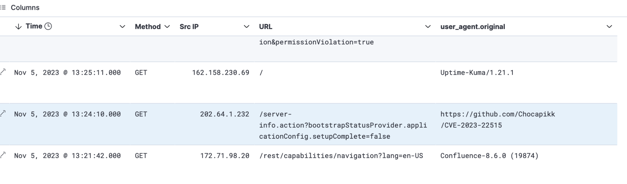 On 13:24:10 the same day, we can see that 202[.]64.1.232 did a GET-request against the Confluence API, specifically calling /server-info.action with the user-agent referring to CVE-2023-22515: Confluence Broken Access Control Exploit.